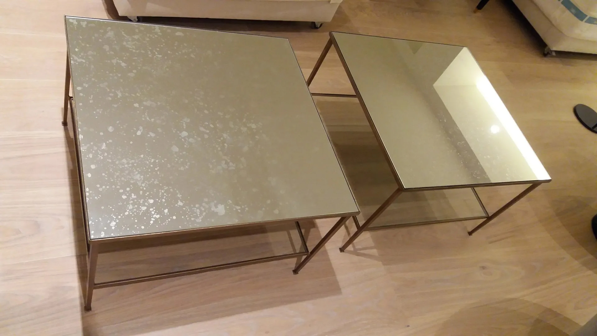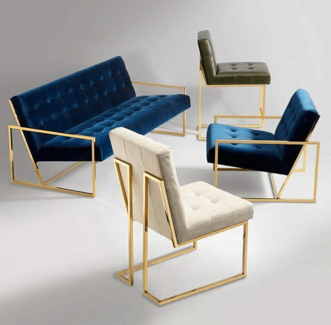 Mobiliario y elementos decorativos con acabados en latón, en combinación con cristal y madera.